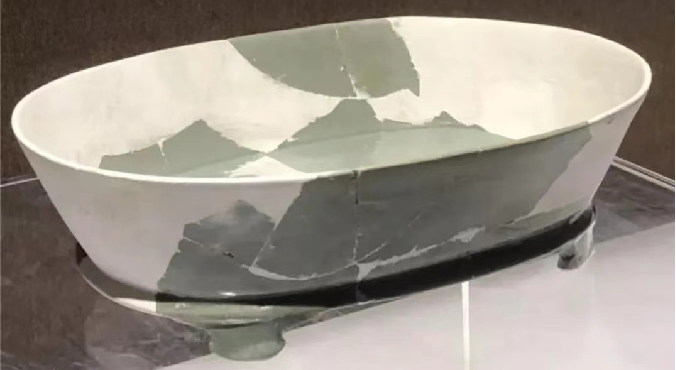 上图二为宝丰汝窑博物馆藏北宋汝窑“水仙盆”修复件